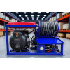 Данная каналопромывочная машина рассчитана на работу с трубами диаметром от 100 до 500 мм. Стационарное исполнение позволяет устанавливать агрегат в кузове автофургона, прицепа или на любой подходящей площадке. Система плавной регулировки давления и трехходовой кран дают оператору полный контроль над процессом очистки, а манометрические датчики позволяют отслеживать давление в системе.